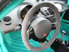 Der Innenraum wurde mit grauem Alcantara für Lenkrad, Türverkleidungen und Armaturentafel links gestaltet. Die Armaturentafel rechts erhielt eine Kohlefaserverkleidung.